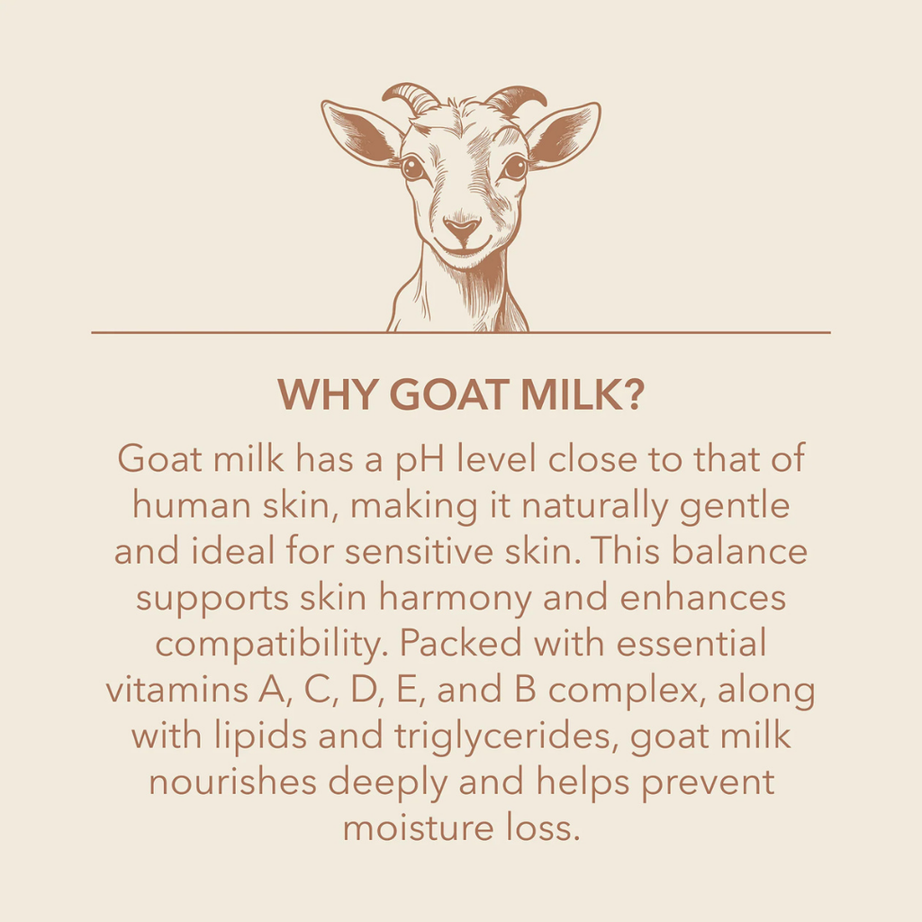 Goat Milk: loaded with vitamins & nutrients, preserves your skin's microbiome, and helps the skin to maintain moisture and suppleness.