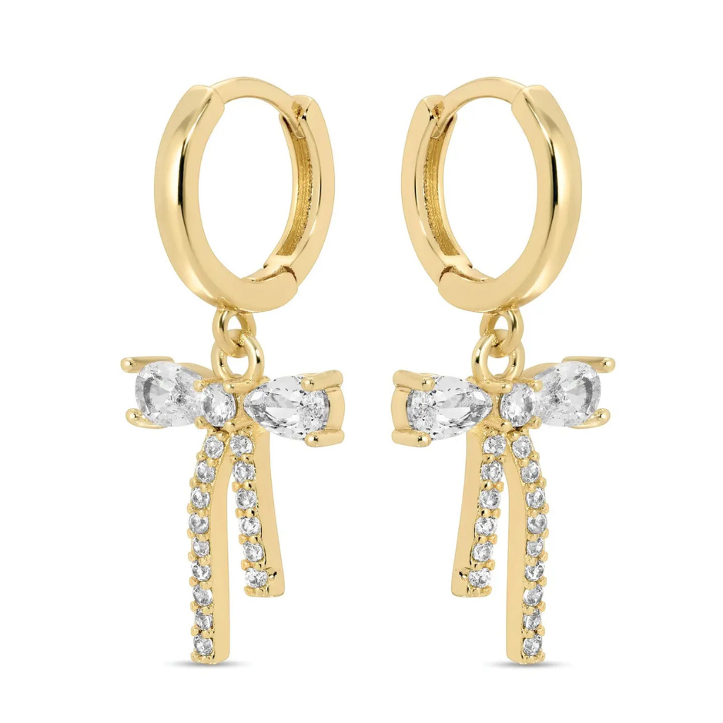 Don't let their compact size fool you—these huggies pack serious sparkle! A charming cubic zirconia bow takes center stage, surrounded by shimmering pavé details that catch the light beautifully. Built on an 18k gold-plated brass base with a graceful 1" drop, they're the perfect blend of fun and glamour for any mood.