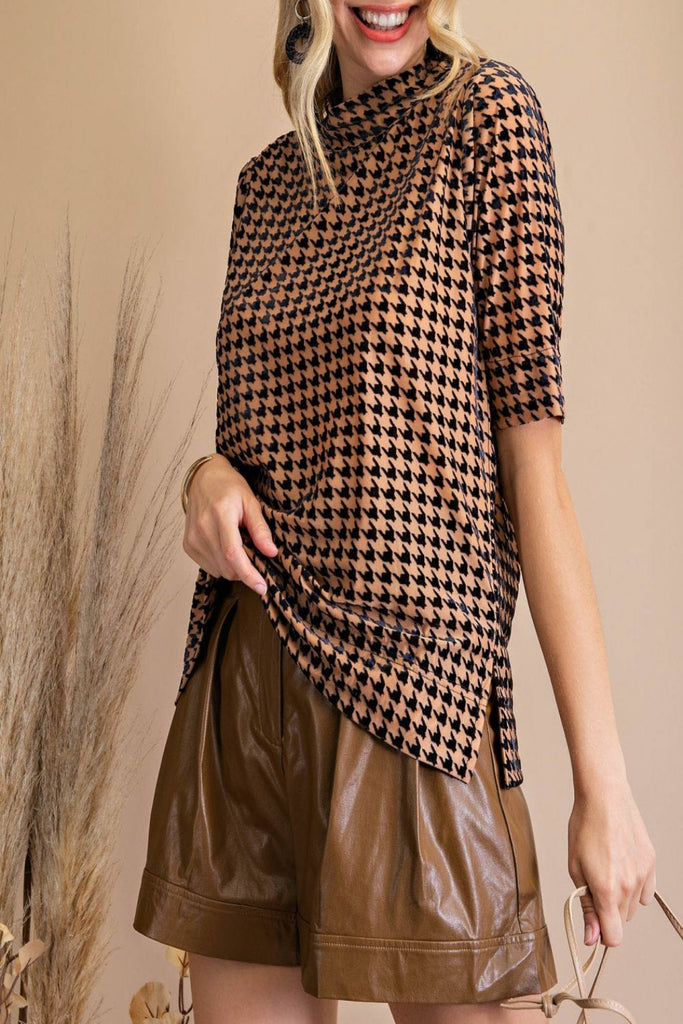 Our All To Well Houndstooth Velvet Burnout Top in Taupe/Black is so trendy and fun!