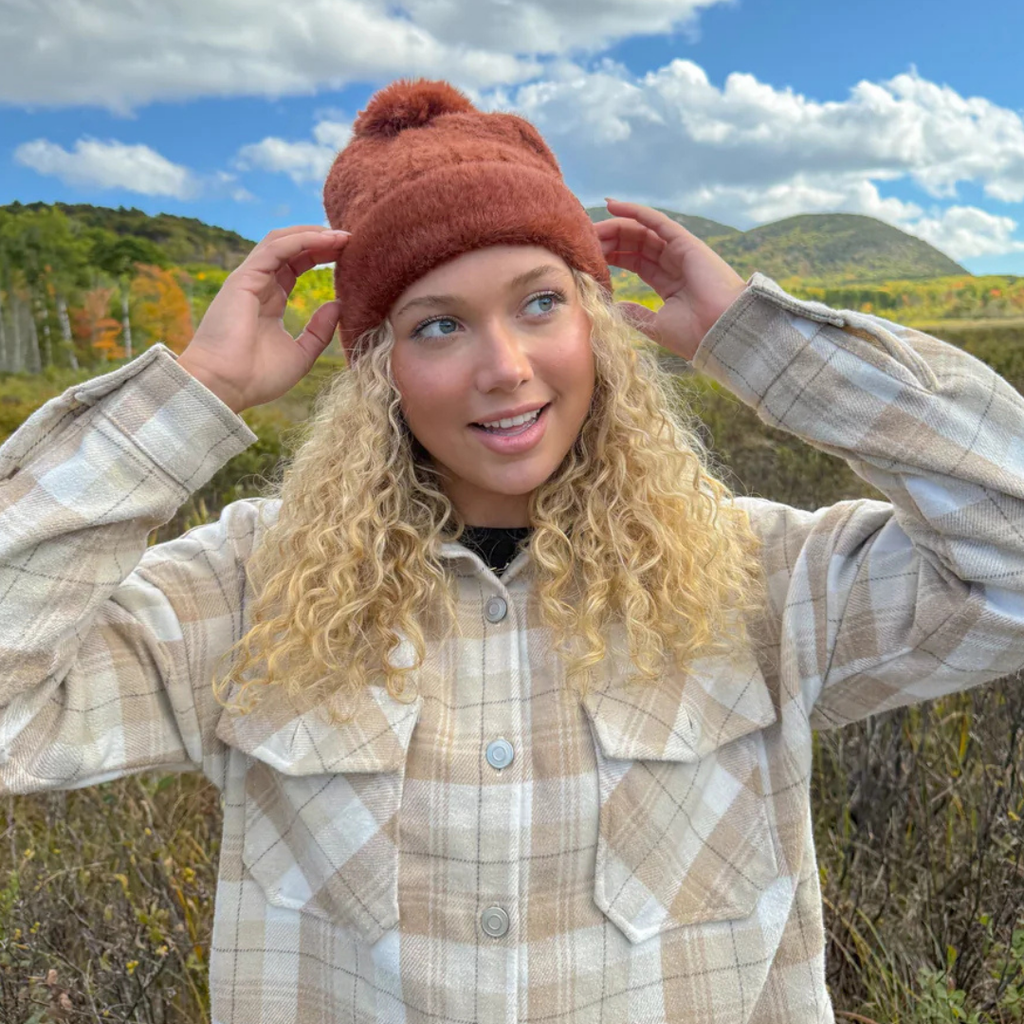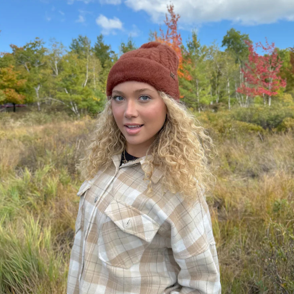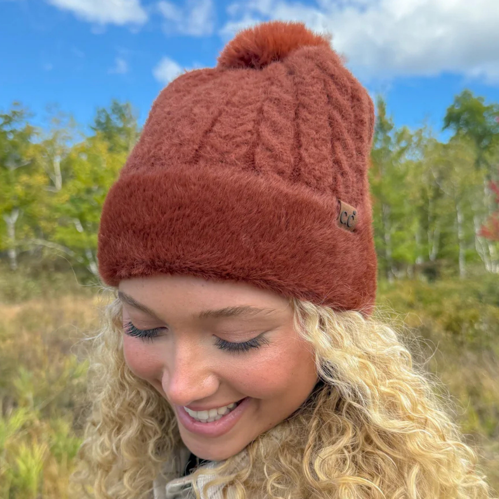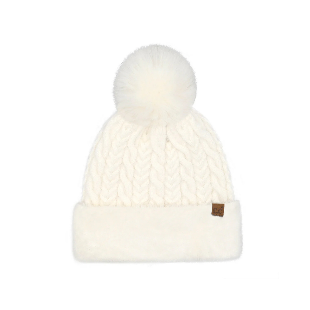 Stay cozy and chic with our C.C Cable Knit Fur Cuff Pom Beanie. This elegant beanie is the perfect winter essential, offering a soft and warm feel, while elevating your basic winter accessories.