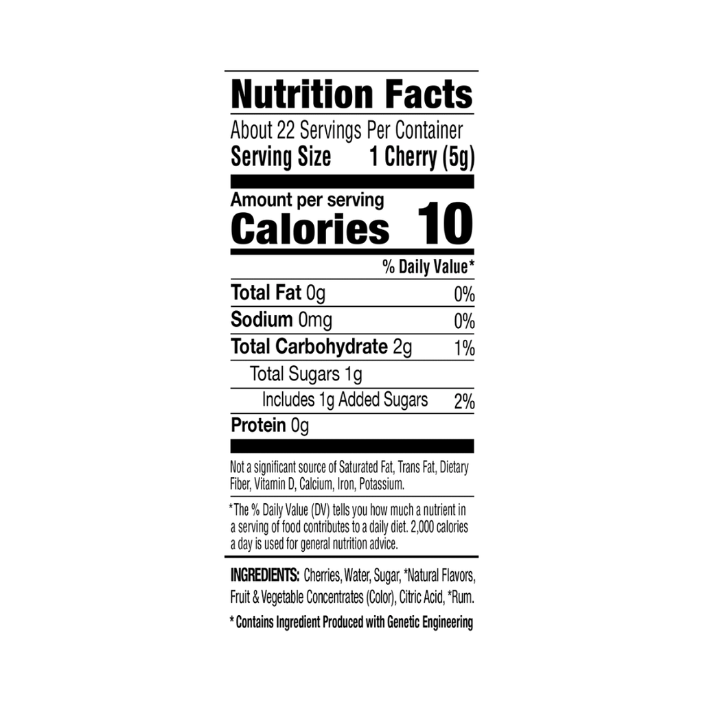 Ingredients: Cherries, Water, Sugar, *Natural Flavors, Fruit & Vegetable Concentrates (Color), Citric Acid, *Rum. * Contains Ingredient Produced with Genetic Engineering
