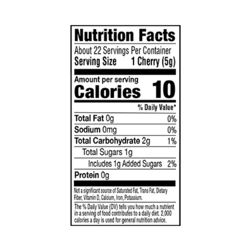 Ingredients: Cherries, Water, Sugar, Fruit and Vegetable Concentrate (color), Citric Acid, Natural Flavor.