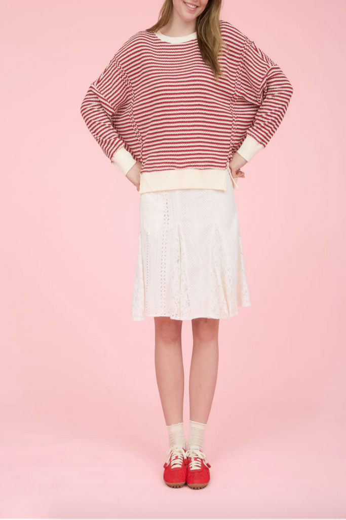 Our In The Wind Striped Knit Top brings casual charm with a modern twist. Featuring a crew neckline, long sleeves, split hem, exposed seam details, and contrasting trim frames the neck, cuffs, and hem. Lightweight and soft, the relaxed fit makes it perfect for layering or wearing solo.