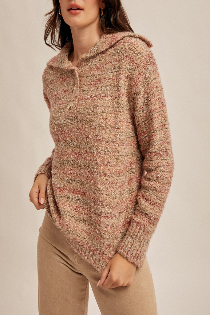 Get cozy in our fun Mind Reader Fuzzy Wide Collar Sweater that's all about effortless style. The oversized wide collar and quarter-button front give you plenty of ways to wear it, while the soft eyelash yarn feels amazing against your skin. Drop shoulders and a relaxed fit mean maximum comfort, and those long sleeves are perfect for layering. Comes in a gorgeous taupe multi shade that goes with everything.