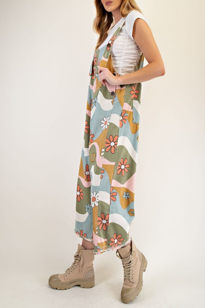 Get ready to rock the effortless and relaxed vibes in our Ripples Flower Print Overalls. Featuring adjustable button straps and a front kangaroo pocket, button closure on the sides and raw cut/frayed hem detailing. These olive camel overalls are the perfect blend of comfort and chic!