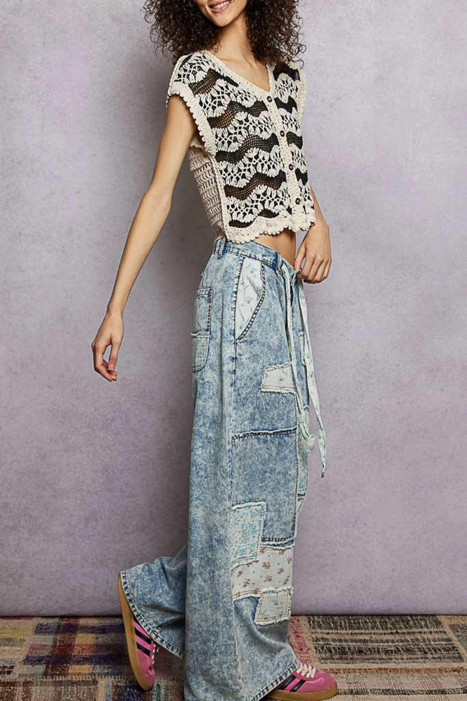 Make a statement with our Melodies Patchwork Straight Leg Pants - where bold design meets everyday comfort. Featuring straight-leg silhouette, a wide waist strap and edgy raw finishing for that effortlessly cool vibe, functional belt loops, a secure button and zip closure, elastic band at back, and roomy front and back pockets. These denim pants rock an eye-catching patchwork pattern that sets them apart from your standard wardrobe staple.