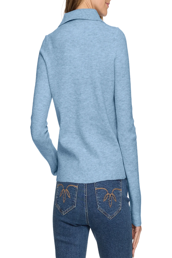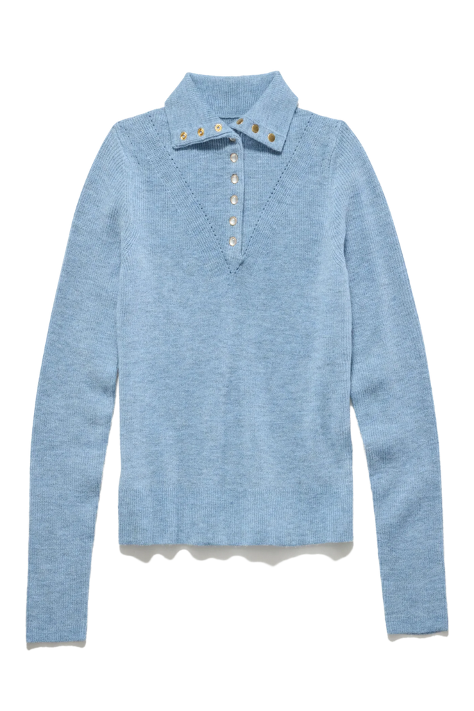 Our Castleberry Mock Neck Sweater is great worn on its own or layered with your favorite vest, blazer, or jacket. Its fun, exaggerated mock neckline is decorated with stylish gold-tone pearl snaps for an effortlessly cool look. Soft and comfy with a subtle heathered finish, this sweater is a versatile staple. Features include a split neckline, functional pearl snap buttons, ribbed detailing on the front yoke, long sleeves, and contrasting ribbed knit accents at the neckline, cuffs, and hem. Fits true to size and comes in a vibrant Blue Multi shade.
